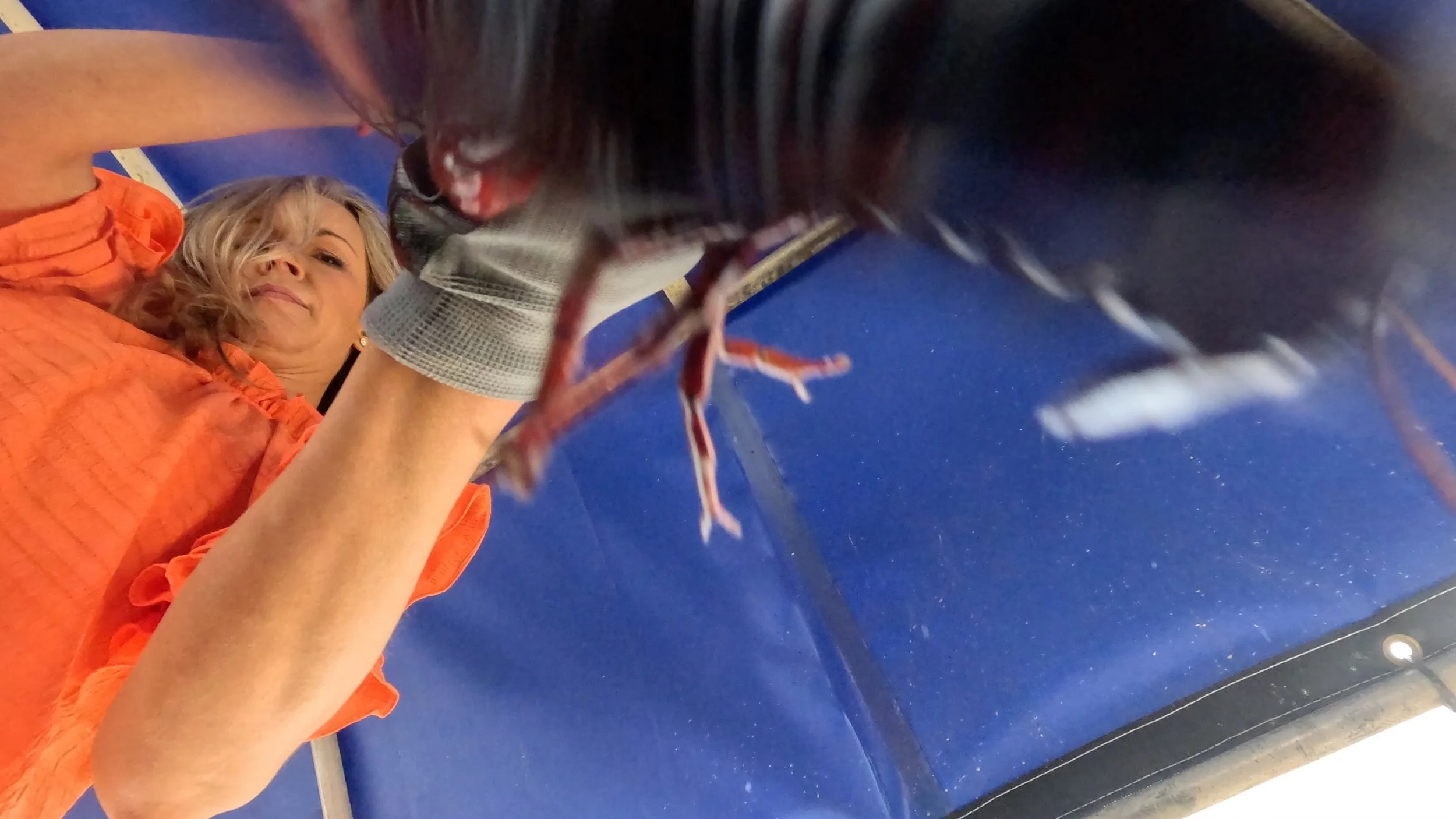 Seven traps down, I thought I was getting the hang of things, until another slippery sucker fell onto the floor of the boat. This was a giant one with monstrous claws— he must be saved! But this crawdad put up a fight, and did not want to go back in the sack with his compadres. Just as I was fighting to get him back in, Barry pointed out that I missed another trap— strike two.