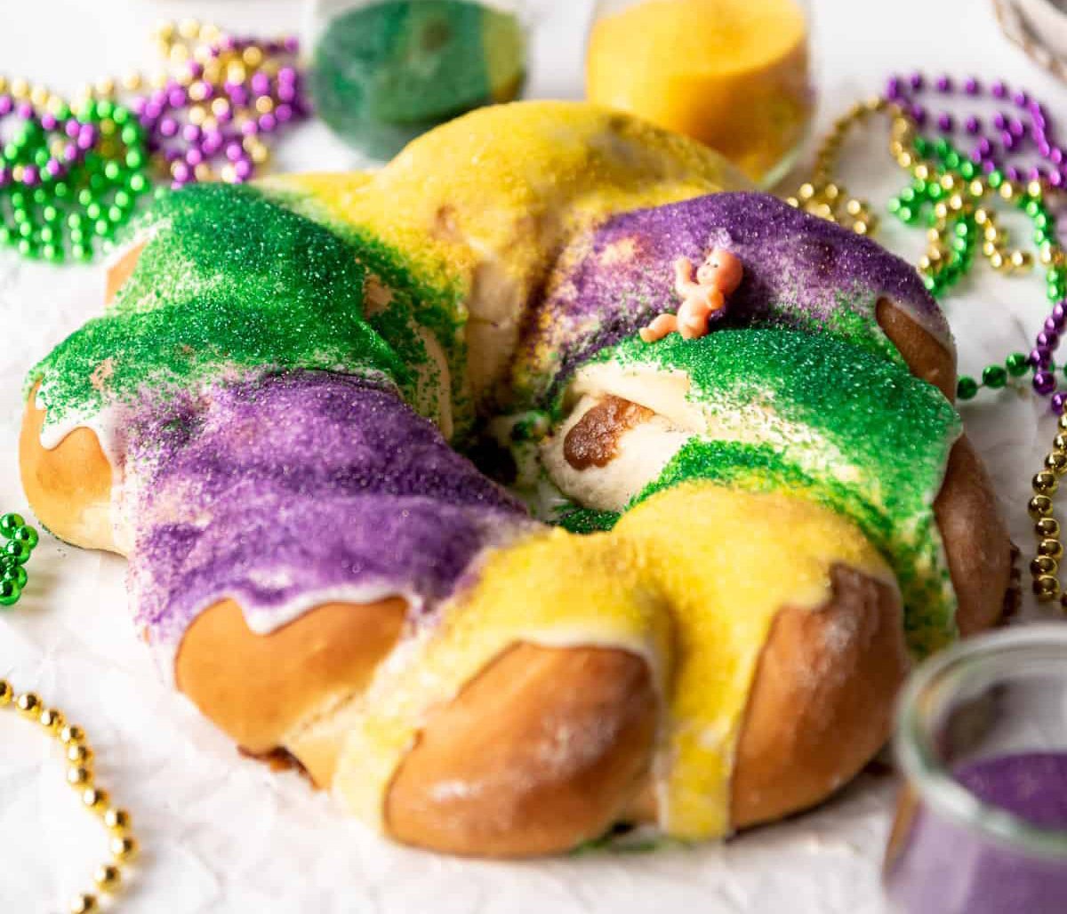 Freezing: You can freeze a finished King Cake for up 2-3 months. Wrap it well with plastic wrap to protect it and keep it stored in an airtight container. Let it thaw on the counter for 2-3 hours before serving.