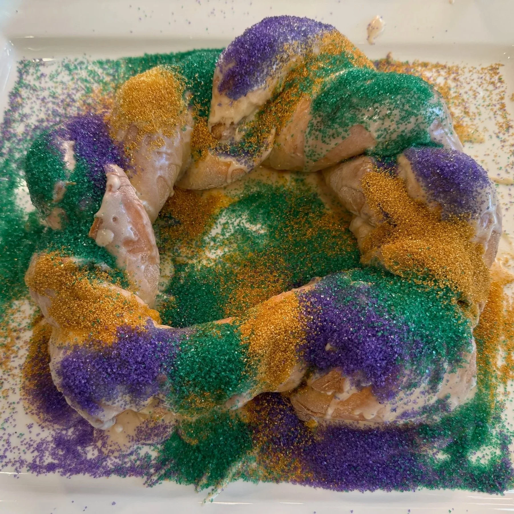 Stick a plastic baby figurine into each cake, pushing it down in to hide it. Drizzle the frosting over both king cakes, spreading it with a spatula if needed for good coverage. Sprinkle with the purple, green, and gold sugar while the frosting is still wet before it has a chance to set.