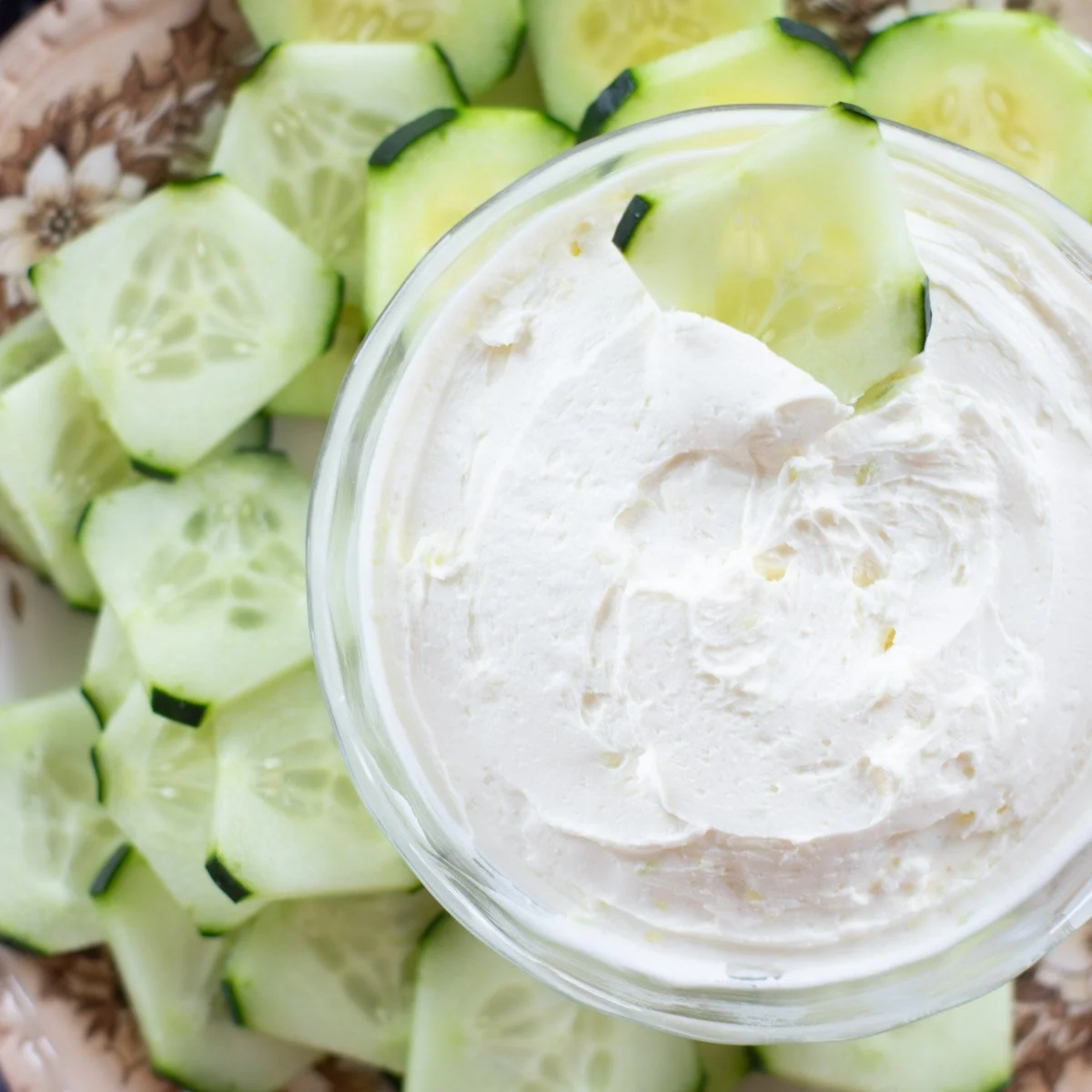 In a small bowl, combine the cream cheese, onion, and seasonings. Once well mixed, incorporate the cucumber, then chill until ready to serve.